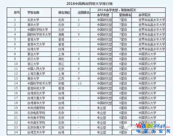 北京體育大學(xué)、中央音樂學(xué)院、中央美術(shù)學(xué)院、北京電影學(xué)院、中央戲劇學(xué)院和臺灣藝術(shù)大學(xué)等6所專業(yè)型高校榮膺2016中國六星級大學(xué),躋身世界高水平大學(xué)、中國頂尖大學(xué)行列。艾瑞深研究院名譽院長、中國綜合大學(xué)排行榜創(chuàng)始人、中南大學(xué)蔡言厚教授指出,北大、清華、國科大、港大、臺大等榮膺2016中國七星級、六星級的研究型大學(xué)其綜合實力和辦學(xué)水平屬于“中國兩岸四地大學(xué)第一方陣”,均是世界高水平大學(xué)、中國頂尖大學(xué),是目前中國兩岸四地創(chuàng)建世界一流大學(xué)的排頭兵和核心力量。