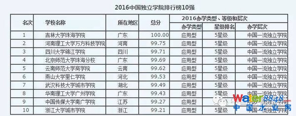 在最新2016中國大學(xué)排行榜中,武昌首義學(xué)院問鼎2016中國民辦大學(xué)排行榜榜首;文華學(xué)院99.81分,名列第二;山東英才學(xué)院99.65分,名列第三;西安歐亞學(xué)院99.57分,位居第四;三亞學(xué)院99.52分,名列第五;山東協(xié)和學(xué)院99.48分,位列第六;吉林華橋外國語學(xué)院99.45分,位居第七;西安外事學(xué)院99.43分,名列第八;湖南涉外經(jīng)濟學(xué)院99.32分,位居第九;江西科技學(xué)院99.14分,名列第十。