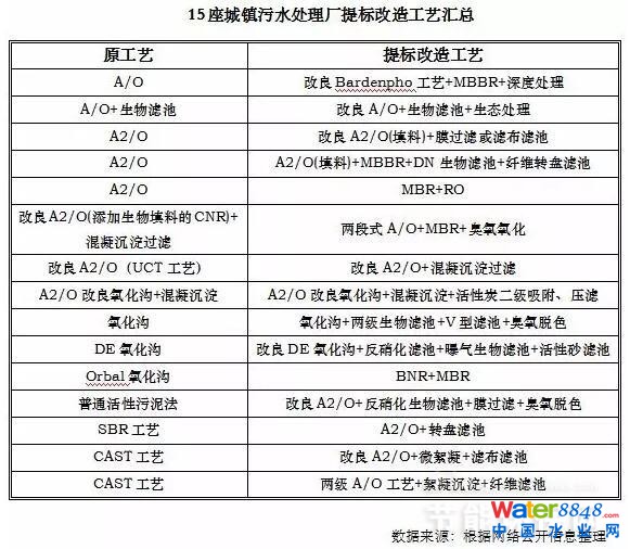另外, 通過互聯(lián)網(wǎng)公開信息報(bào)道匯總整理了15座城鎮(zhèn)污水處理廠提標(biāo)改造技術(shù)工藝,該小樣本數(shù)據(jù)顯示目前有一定比例的城鎮(zhèn)污水處理提標(biāo)改造為在原有技術(shù)工藝基礎(chǔ)上,在二級(jí)處理階段,強(qiáng)化生物處理或增加生化處理,在三級(jí)處理階段以深度過濾為主;另外還有一部分為MBR工藝。