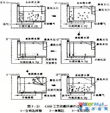 CASS工藝集反應、沉淀、排水、功能于一體,污染物的降解在時間上是一個推流過程,而微生物則處于好氧、缺氧、厭氧周期性變化之中,從而達到對污染物去除作用,同時還具有較好的脫氮、除磷功能。