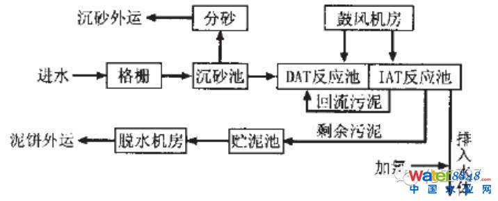 DAT池和IAT池串聯(lián)組成,DAT 連續(xù)進水,連續(xù)曝氣(也可間歇曝氣),IAT也是連續(xù)進水,但間歇曝氣,清水和剩余活性污泥均由IAT池排出。和典型的SBR 反應池一樣,IAT 池運行操作由進水、反應、沉淀、出水和待機5個階段組成。