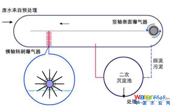 氧化溝是延時曝氣法的一種特殊形式,它的池體狹長,池深較淺,在溝槽中設有表面曝氣裝置。