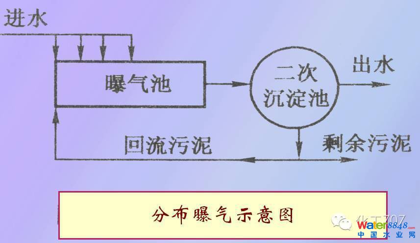 在分步曝氣的基礎上,進一步大大增加進水點,同時相應增加回流污泥并使其在曝氣池中迅速混合,長條形池子中也能做到完全混合狀態(tài)。