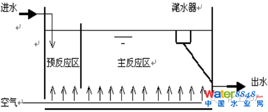 反應池由兩部分組成,前一部分為預反應區(qū),也稱進水曝氣區(qū),后一部分為主反應區(qū)。主、預反應區(qū)之間的底部有孔洞相連,污水以很低的流速有預反應區(qū)進入主反應區(qū)。