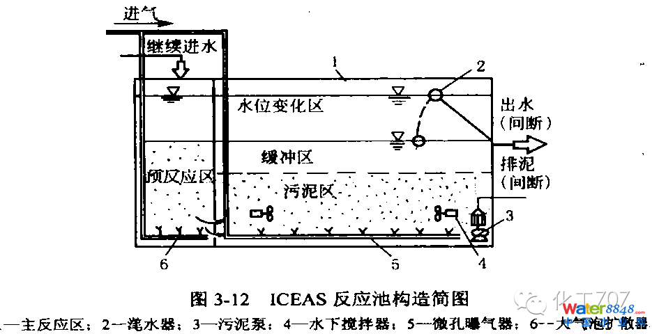 DAT 池為預反應池,也稱為連續(xù)曝氣區(qū),池中水流呈完全混合流態(tài),絕大部分有機物在這個池中降解。IAT相當一個傳統(tǒng)的SBR 池,但進水為連續(xù)流。