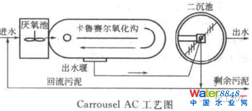 2.A2/C氧化溝與A2/O很相似。由于該型氧化溝采用了獨特的水力構造,可以取消由好氧池至缺氧池的混合液回流設備,因而節(jié)約用于混合液回流的能耗。