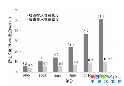 新型城鎮(zhèn)化建設(shè)對城市基礎(chǔ)設(shè)施提出更高的要求,改善水環(huán)境質(zhì)量的呼聲越來越高,對排水工程重要性的認識不斷提高。近20年城鎮(zhèn)排水管網(wǎng)規(guī)模得到了快速增長,如圖1所示,城鎮(zhèn)排水管道長度和排水管網(wǎng)覆蓋率的增加,有效降低了城鎮(zhèn)內(nèi)澇風險,為城鎮(zhèn)水安全保障和水環(huán)境改善奠定了基礎(chǔ)。