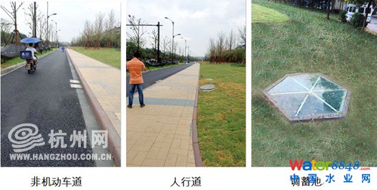 走在新建成的紫金港路上,如果你仔細(xì)觀察,道路兩側(cè)非機(jī)動(dòng)車道及人行道鋪裝的材質(zhì)與以往的道路材質(zhì)明顯不一樣,東側(cè)的綠化帶內(nèi)還有一個(gè)個(gè)與路面上雨污井不同的井體。