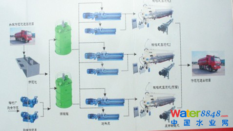無錫錫山污水處理廠成立于2002年,日處理污水7萬t/d,污泥含水率97%——98%左右。2010年12月,約1000m3/d的錫山污泥脫水處置項(xiàng)目開工建設(shè),并預(yù)留了遠(yuǎn)期處理能力。 錫山污泥處置項(xiàng)目直接調(diào)質(zhì)深度脫水,現(xiàn)場布置了3臺(tái)泥水一體化板框壓濾機(jī),處理后含水率由98%降至60%以下,污泥減量達(dá)60%。其中 “泥漿螺旋分配器”、“凸起粒子濾板”、“錐形濾布”等設(shè)備均由無錫國聯(lián)自主研發(fā)。板框壓濾脫水時(shí)采用間隔的“遞增式”施壓脫水工藝,經(jīng)過壓濾機(jī)處理的濕污泥變成了一塊塊的污泥干餅,含水率得到大幅降低。
