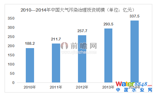 2010年到2014年,我國對大氣污染治理的投資金額分別達(dá)到188.2億元、211.7億元、257.7億元、293.5億元與337.5億元,總體呈現(xiàn)不斷上漲的趨勢。