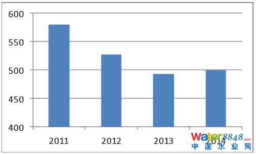 工業(yè)部門是用水大戶。2014年,工業(yè)總用水量1356.1億噸,、占全國年用水總量的22.2%。萬元工業(yè)增加值用水量從2007年的126噸下降至2014年的59.5噸。受用水量減少影響,工業(yè)廢水處理量和處理費用較2011年的峰值略有回落。2014年,共處理工業(yè)廢水500億噸。