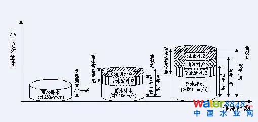 圖1引自《日本下水道設(shè)計(jì)指南》(2001年版)中日本橫濱市鶴見(jiàn)川地區(qū)的“不同設(shè)計(jì)重現(xiàn)期標(biāo)準(zhǔn)的綜合應(yīng)對(duì)措施”。圖1反映了該地區(qū)從單一的城市排水管道排水系統(tǒng)到包含雨水管渠、內(nèi)河和流域調(diào)蓄等綜合應(yīng)對(duì)措施在內(nèi)的內(nèi)澇防治系統(tǒng)的發(fā)展歷程。當(dāng)采用雨水調(diào)蓄設(shè)施中的排水管道調(diào)蓄應(yīng)對(duì)措施時(shí),該地區(qū)的設(shè)計(jì)重現(xiàn)期可達(dá)10年一遇,可排除50mm/h的降雨;當(dāng)采用雨水調(diào)蓄設(shè)施和利用內(nèi)河調(diào)蓄應(yīng)對(duì)措施時(shí),設(shè)計(jì)重現(xiàn)期可進(jìn)一步提高到40年一遇;在此基礎(chǔ)上再利用流域調(diào)蓄時(shí),可應(yīng)對(duì)150年一遇的降雨。