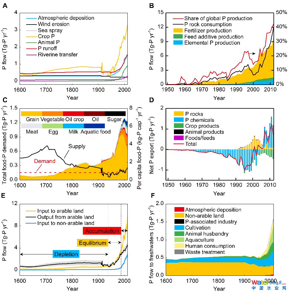 圖 1. (A), 中國主要磷流變化;(B), 磷礦石生產(chǎn)與消費結構變化;(C), 主要食物磷需求變化;(D), 磷礦石及主要含磷產(chǎn)品進出口變化;(E), 土壤磷庫存變化;(F), 地表水體磷輸入變化