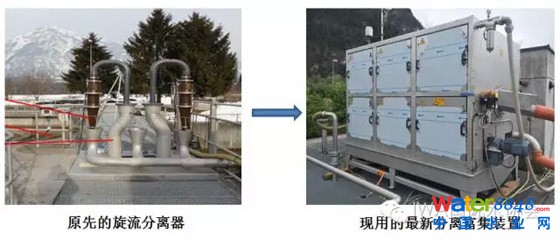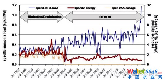 從上圖可以看出,自2004年Strass污水廠引入側(cè)流DEMON技術(shù)后,無需再外加碳源即可進行脫氮,脫氮的能耗也隨之降低近一半。自2016年初工廠還采用了最新的分離富集設備代替原先的旋流分離器,側(cè)流系統(tǒng)的氨氮負荷可提高至1.0KgN/m3/d以上,并穩(wěn)定運行。