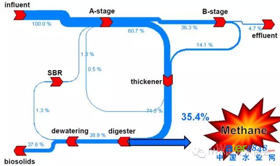 采用傳統(tǒng)AB處理工藝的奧地利Strass污水廠,因在能源自給方面取得的成功而名聲大噪。早在20世紀90年代,Strass污水廠就開始關(guān)注如何能在滿足工廠運行之外實現(xiàn)產(chǎn)能。其合理性在于污水中蘊含的能量遠高于處理污水所需的能耗。典型的歐洲污水按人口當量計算,理論上污水中蘊含的能量為18W/person,而處理污水的能耗約為5-7W/person。
