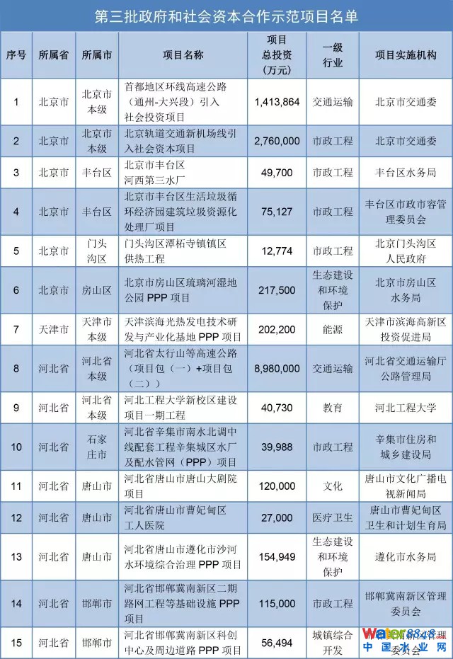 為進(jìn)一步推進(jìn)政府和社會資本合作(以下簡稱PPP)工作取得實(shí)質(zhì)性進(jìn)展,發(fā)揮示范項(xiàng)目引領(lǐng)作用,調(diào)動社會資本參與積極性,財(cái)政部會同相關(guān)部門聯(lián)合啟動了第三批政府和社會資本合作示范項(xiàng)目申報(bào)篩選工作,F(xiàn)將評審結(jié)果及有關(guān)事宜通知如下: