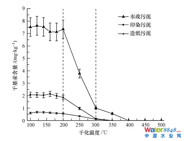 當(dāng)干化溫度在>200~300 ℃的條件下,3種污泥中的汞含量均出現(xiàn)大幅度地下降,在干化溫度為300 ℃時(shí),市政污泥、印染污泥和造紙污泥中干基汞含量分別為1.009、0.140和0.107 mg ˙ kg-1,相對(duì)于100 ℃下干基汞含量,汞的殘留率分別為13.4%、6.7%和17.7%.這表明在該溫度區(qū)間內(nèi),污泥中的汞是不穩(wěn)定的,隨著污泥中有機(jī)物開始發(fā)生大量的熱解,使得污泥中一部分汞的化合物分解,這必然導(dǎo)致汞的大量析出.當(dāng)干化溫度大于400 ℃時(shí),污泥中幾乎所有的汞全部析出,這是污泥中汞的附著體消失的必然結(jié)果,因?yàn)樵谶@樣的高溫下,污泥中的全部有機(jī)物及汞的化合物(如HgS)均發(fā)生了熱解.