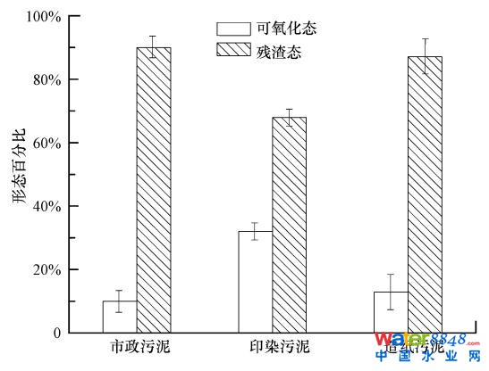 圖 4顯示了常溫下新鮮污泥中汞的形態(tài)分特征.從圖 4可以看出,在常溫條件下,3種新鮮污泥中只存在可氧化態(tài)和殘?jiān)鼞B(tài)2種形態(tài)的汞.市政污泥、印染污泥、造紙污泥中可氧化態(tài)汞和殘?jiān)鼞B(tài)汞所占比例分別為10%、33%、13%和90%、67%、87%,這表明污泥中不存在酸溶性汞和與可還原性Fe-Mn氧化物結(jié)合的汞,污泥中存在的汞除了部分與有機(jī)活性基團(tuán)及硫離子相結(jié)合外,大部分結(jié)合在原生或次生礦物中.污泥中汞的這種形態(tài)分布特征揭示了污泥中存在具有潛在環(huán)境毒性的可氧化態(tài)汞,在3種被試污泥中印染污泥的潛在危害性相對(duì)較大.