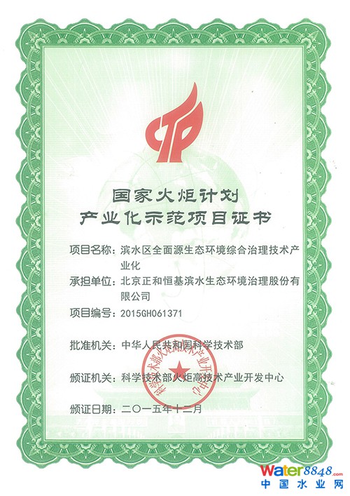 正和恒基“濱水區(qū)全面源生態(tài)環(huán)境綜合治理技術(shù)產(chǎn)業(yè)化”項(xiàng)目榮獲 “國家火炬計(jì)劃產(chǎn)業(yè)化示范項(xiàng)目證書” 2016-09-08 |