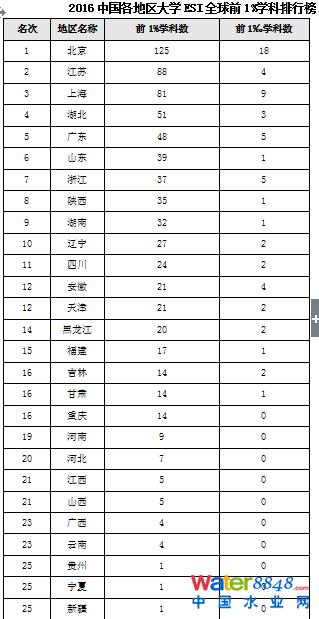 2016中國各地區(qū)大學ESI全球前1%學科排行榜