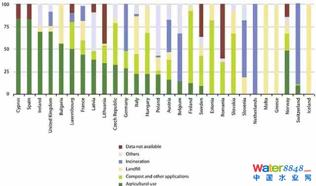 Eurostat統(tǒng)計(jì)的2009年歐洲各國(guó)城市污水處理廠對(duì)產(chǎn)生污泥的處置方式