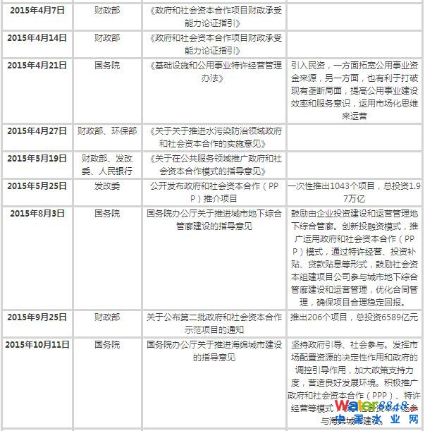 近年來,國務(wù)院、財政部、發(fā)改委多部門均發(fā)布各項政策鼓勵PPP模式的發(fā)展,財政部、全國各地政府也相繼發(fā)布PPP項目庫。今年3月份,財政部聯(lián)合建設(shè)銀行、中國人壽等10家機構(gòu),共同發(fā)起設(shè)立中國政府和社會資本合作(PPP)融資支持基金,運行1800億元基金的政企合作投資基金公司正式成立,更利于PPP的發(fā)展。