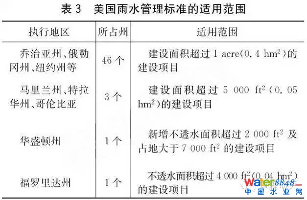 1987年,美國將非點源污染控制納入到“國家污染排放許可證制度(National PollutantDischarge Elimination System, NPDES)”時,90%的州規(guī)定占地面積超過1英畝(約4000平方米)的建設(shè)項目需獲得雨水排放許可,多數(shù)州級別的NPDES許可(由國家EPA授權(quán)執(zhí)行)及相關(guān)雨水法規(guī)規(guī)定的適用范圍與國家層面的NPDES許可相同,但華盛頓州市政雨水許可、福羅里達(dá)州環(huán)境資源許可、馬里蘭州雨水法規(guī)、特拉華州的沉淀物及雨水法規(guī)和哥倫比亞特區(qū)市政法規(guī)制定了更為嚴(yán)格的要求。通常選擇控制標(biāo)準(zhǔn)時在滿足聯(lián)邦政府、州、地方法律和條例要求下,執(zhí)行各州或地區(qū)更為嚴(yán)格的控制標(biāo)準(zhǔn)。各州雨水管理標(biāo)準(zhǔn)的適用范圍見表3。