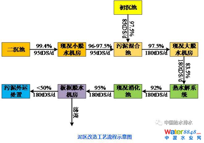 1泥線工藝流程由于本廠水區(qū)進(jìn)行改造,增加深度處理措施,導(dǎo)致泥區(qū)處理量增加,現(xiàn)泥區(qū)的設(shè)計處理量為180tDS/d。