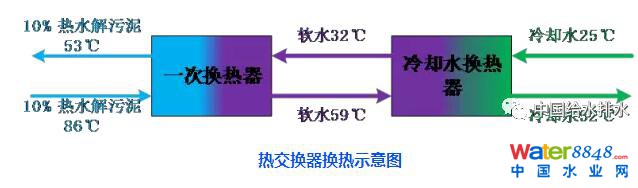 熱交換車間為熱水解后高溫污泥進(jìn)行冷卻以及稀釋的構(gòu)筑物。車間內(nèi)主要布置一次熱交換器及冷卻水換熱器。一次熱交換器,其功率920kW,流量37.9m3/h,10%熱污泥,Tin=85.9℃,pH4.5-5.5;冷卻水,流量40-60m3/h,軟化水,Tin=32℃,pH6.5-7.5。冷卻水換熱器,其功率1890kW,冷側(cè)溫度25℃;熱側(cè)流量40-60m3/h,進(jìn)水溫度59℃,冷卻后溫度32℃。經(jīng)冷卻和稀釋后,將含水率92%、溫度在53℃左右的污泥送入消化池進(jìn)行厭氧消化。