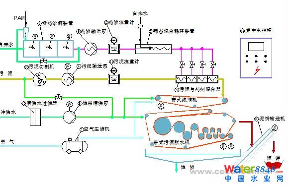 污泥是特別為廢水處理的污泥脫水而設(shè)計的雙濾帶式濃縮脫水一體機。由污泥調(diào)理裝置、前處理旋轉(zhuǎn)離心裝置、污泥勻配系統(tǒng)、重力脫水區(qū)、楔型壓縮區(qū)、預壓脫水區(qū)、低壓脫水區(qū)、剪力脫水區(qū)、自動清洗裝置、濾布傳動裝置、濾布自動校正系統(tǒng)、濾布保護裝置、緊急保護裝置及輔助設(shè)備等組成。 高分子聚合物及污泥經(jīng)由高分子加藥機及污泥泵注入污泥凝集混合器,在混合器混合后經(jīng)由污泥均配裝置均勻散布注入于濾帶上。經(jīng)重力脫水區(qū)、楔型壓縮區(qū)、預壓脫水區(qū)、低壓脫水區(qū)、剪力脫水區(qū)等一系列的壓濾作用,沿著濾帶行進方向持續(xù)加壓于污泥上,直到的污泥餅由排放口掉落。