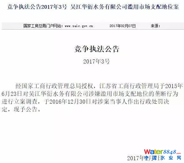 2月7日,國家工商總局公布了江蘇省工商行政管理局對吳江華衍水務有限公司濫用市場支配地位案的處罰決定書。