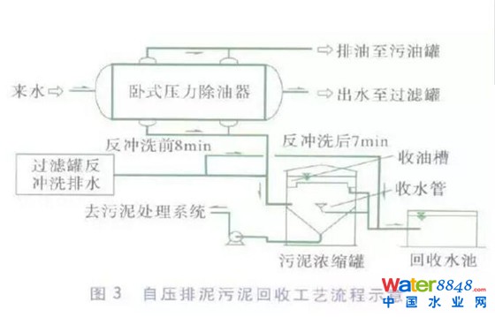 采用自壓排泥、污泥濃縮工藝。對于高效沉降分離設(shè)備,建議在新建和改造污水處理工藝工程設(shè)計中,采用自壓排泥、污泥濃縮的污泥回收工藝。該工藝是利用壓力式沉降分離除油設(shè)備(指臥式壓力除油器)的自身壓力,將設(shè)備底部分離出的污泥,直接壓至污泥濃縮罐中濃縮處理。該方法具有操作簡單、無需停產(chǎn)的特點(diǎn),同時兼有將初期反沖洗排出水回收進(jìn)入污泥濃縮罐的功能。工藝流程示意見圖3。