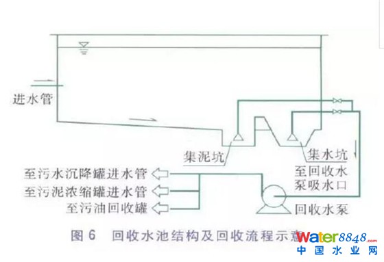 新建污水回收水池的設(shè)計回收水池內(nèi)分別設(shè)置集水坑和集泥坑,使回收水泵可以對集水坑和集泥坑內(nèi)的污水和污泥分別吸取,回收水泵采用螺桿泵,并設(shè)置三個出口,在正常運(yùn)行時,吸取集水坑內(nèi)的污水,該污水污泥量較少,可送至污水沉降罐進(jìn)口;若污泥較多時,可吸取集泥坑內(nèi)的污泥送至污泥濃縮罐;當(dāng)池內(nèi)液位較低、泵吸至上部油層時,可送至污油回收罐中;厥账亟Y(jié)構(gòu)及回收流程示意見圖6。