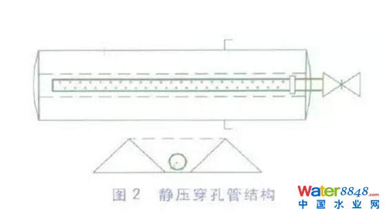 根據(jù)含油污水處理工藝的實際情況,在重力式污水沉降罐底部加裝中密度聚乙烯穿孔管,將管道排泥設(shè)施改為穿孔管,依靠罐體自身的靜壓水頭排泥。靜壓穿孔管結(jié)構(gòu)見圖2。