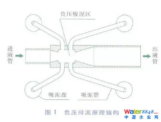 針對含油污水處理工藝中的沉降分離設(shè)備(自然沉降罐和混凝沉降罐)、污水緩沖罐、反沖洗水罐以及外輸水罐,建議將沉降分離設(shè)備中的管道排泥設(shè)施改為排泥器。排泥器主要應(yīng)用水射器工作原理,每個排泥器上的水射器與四個吸盤連通,高速噴射的液體流過水射器產(chǎn)生負(fù)壓,再通過排泥器的每個吸泥盤的服務(wù)面積,均勻、徹底地將設(shè)備底部沉降的污泥定期排出,達(dá)到排泥的目的。其原理結(jié)構(gòu)簡圖見圖1。