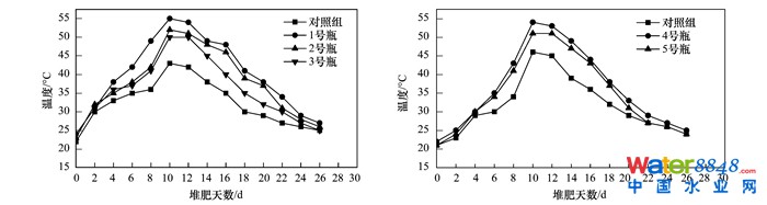 溫度與堆體中微生物的代謝活動密不可分,可間接地表現(xiàn)微生物對有機(jī)質(zhì)的利用程度,亦從一定意義上可表征堆肥效應(yīng)是否達(dá)到無害化,因此本實驗對兩個堆肥周期堆體溫度的變化進(jìn)行了分析,如圖 1所示.