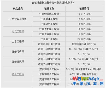 注冊(cè)會(huì)計(jì)師,4萬(wàn)~4.5萬(wàn)/年(掛法人);注冊(cè)一級(jí)消防工程師,8萬(wàn)/年;注冊(cè)一級(jí)建筑工程師,8萬(wàn)~12萬(wàn)元/2年;注冊(cè)巖土工程師,25萬(wàn)~28萬(wàn)元/3年……近日,一張名為“2016年各證書最新掛靠?jī)r(jià)格一覽表”的表格流傳網(wǎng)絡(luò),一些通過(guò)率低的資格證書掛靠費(fèi)甚至超過(guò)一些職業(yè)的年均工資水平。