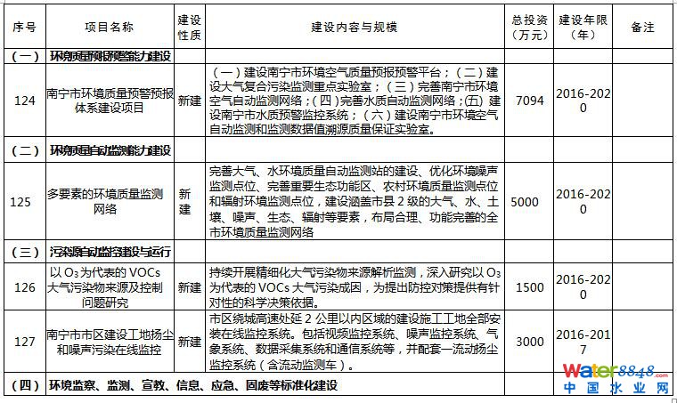 日前,《南寧市環(huán)境保護(hù)“十三五”規(guī)劃》已經(jīng)印發(fā)。規(guī)劃以提高環(huán)境質(zhì)量為主線,緊緊圍繞大氣、水體、土壤污染防治三大戰(zhàn)役,深入開展大氣、水、土壤環(huán)境質(zhì)量改善項(xiàng)目。規(guī)劃提到,開展大氣污染防治,全力推進(jìn)工業(yè)大氣二氧化硫和氮氧化物減排。全面推進(jìn)清潔生產(chǎn),推動(dòng)工業(yè)鍋爐脫硫工作,以熱電聯(lián)產(chǎn)、工業(yè)園區(qū)統(tǒng)一供熱或清潔能源替代小型燃煤鍋爐,規(guī)模在20噸/小時(shí)以上的燃煤鍋爐要實(shí)施煙氣脫硫改造。持續(xù)推進(jìn)火電、有色冶煉、石油石化、水泥、陶瓷等行業(yè)脫硫脫硝工程,在火電、水泥、冶金、制糖等行業(yè)推行低氮燃燒技術(shù)。本規(guī)劃共列出重點(diǎn)工程142項(xiàng),總投資估算396.83億元,涉及大氣污染治理、污水處理、垃圾處理等環(huán)保項(xiàng)目。詳情如下:
