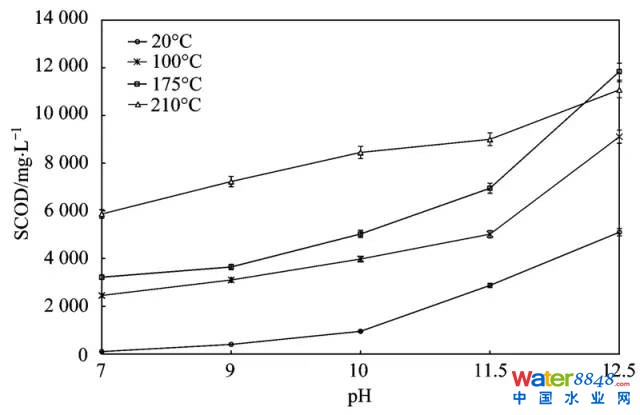 為了驗(yàn)證正交試驗(yàn)得出的單位污泥SCOD隨溫度和pH的變化趨勢,進(jìn)行如下驗(yàn)證試驗(yàn):采用8 mol ˙L-1 NaOH分別將污泥pH調(diào)節(jié)為6.9±0.1、 9.0±0.1、 10±0.1、 11.5±0.1、 12.5±0.1,并穩(wěn)定5 min. 再將上述5種不同pH值污泥分別置于20、 100、 175及210℃處理60 min,冷卻后進(jìn)行相關(guān)分析,各做3組平行試驗(yàn). 1.3 分析方法