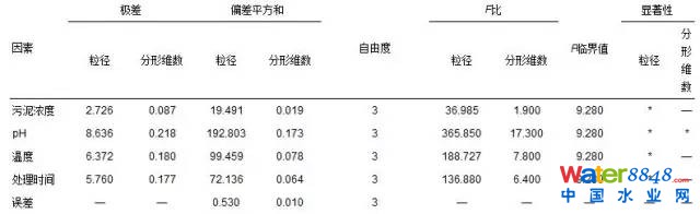 表 5 污泥粒徑及分形維數(shù)正交試驗(yàn)極差及方差分析 1)