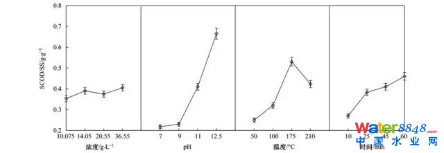 圖 1 污泥SCOD隨各因素的變化