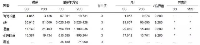 表 4 污泥SS、 VSS正交試驗(yàn)極差及方差分析 1)