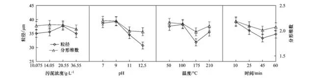 圖 4 污泥粒徑及分形維數(shù)隨各因素的變化