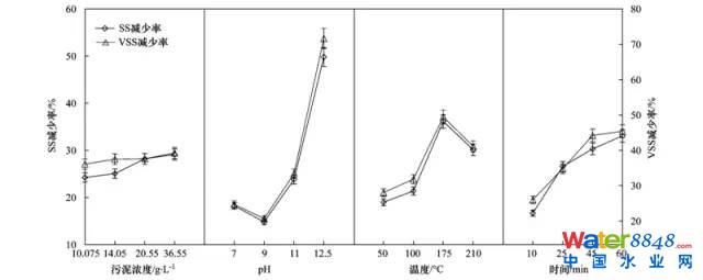 根據(jù)表 2中的試驗(yàn)結(jié)果,可以得到污泥SS、 VSS減少率隨4個因素的變化(圖 3). 從圖 3中可知,SS、 VSS減少率隨處理時間延長和污泥濃度升高而升高,但隨污泥濃度的增加幅度小,這一變化規(guī)律與文獻(xiàn)一致. 此外,SS、 VSS減少率隨溫度的升高呈先升高后降低的趨勢,此趨勢與文獻(xiàn)一致. 但是,SS、 VSS減少率卻隨pH的升高呈先降低后升高的趨勢. 圖 3表明,在本試驗(yàn)條件下,4個因素對熱堿處理降低SS、 VSS的最佳組合條件為:污泥濃度36.55 g ˙L-1、 pH 12.5、 溫度175℃和處理時間60 min. 對比單位污泥SCOD和污泥濃度(SS和VSS)的變化(表 2、 圖 1和圖 3)可知,4個因素對3個參數(shù)的影響相似,這主要是由于污泥SCOD的釋放來源于污泥絮體和微生物細(xì)胞的破裂、 融胞所釋放的有機(jī)物,有機(jī)物釋放會使一部分不溶性物質(zhì)轉(zhuǎn)化為溶解性物質(zhì),從而降低污泥濃度.