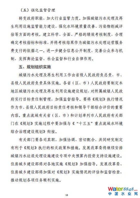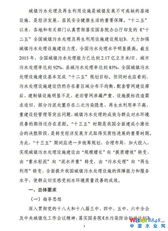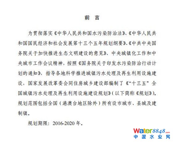 為貫徹落實(shí)《中華人民共和國水污染防治法》、《中華人民共和國國民經(jīng)濟(jì)和社會發(fā)展第十三個五年規(guī)劃綱要》、《中共中央國務(wù)院關(guān)于加快推進(jìn)生態(tài)文明建設(shè)的意見》、中央城鎮(zhèn)化工作和中央城市工作會議精神,按照《國務(wù)院關(guān)于印發(fā)水污染防治行動計劃的通知》,指導(dǎo)各地科學(xué)推進(jìn)城鎮(zhèn)污水處理及再生利用設(shè)施建設(shè),國家發(fā)展改革委會同住房城鄉(xiāng)建設(shè)部編制了《“十三五”全國城鎮(zhèn)污水處理及再生利用設(shè)施建設(shè)規(guī)劃》(以下簡稱《規(guī)劃》)。規(guī)劃范圍包括全國(港澳臺地區(qū)除外)所有設(shè)市城市、縣城及建制鎮(zhèn)。規(guī)劃期限:2016-2020 年。 1 城鎮(zhèn)污水處理及再生利用設(shè)施是城鎮(zhèn)發(fā)展不可或缺的基礎(chǔ)設(shè)施,是經(jīng)濟(jì)發(fā)展、居民安全健康生活的重要保障。“十二五” 以來,各地和有關(guān)部門認(rèn)真貫徹落實(shí)國務(wù)院辦公廳印發(fā)的《“十二五”全國城鎮(zhèn)污水處理及再生利用設(shè)施建設(shè)規(guī)劃》,大力加強(qiáng)城鎮(zhèn)污水處理設(shè)施建設(shè)力度,全國污水處理水平明顯提高。截至 2015 年,全國城鎮(zhèn)污水處理能力已達(dá)到 2.17 億立方米/日,城市污水處理率達(dá)到 92%,縣城污水處理率達(dá)到 85%,全國城鎮(zhèn)污水處理設(shè)施建設(shè)基本完成“十二五”規(guī)劃目標(biāo)。但同時也應(yīng)看到,污水處理設(shè)施建設(shè)仍然存在著區(qū)域分布不均衡、配套管網(wǎng)建設(shè)滯后、建制鎮(zhèn)設(shè)施明顯不足、老舊管網(wǎng)滲漏嚴(yán)重、設(shè)施提標(biāo)改造需求迫切、部分污泥處置存在二次污染隱患、再生水利用率不高、重建設(shè)輕管理等突出問題,城鎮(zhèn)污水處理的成效與群眾對水環(huán)境改善的期待還存在差距。“十三五”時期是我國全面建成小康社會的決勝階段,是轉(zhuǎn)變經(jīng)濟(jì)發(fā)展方式取得實(shí)質(zhì)性進(jìn)展的重要時期。