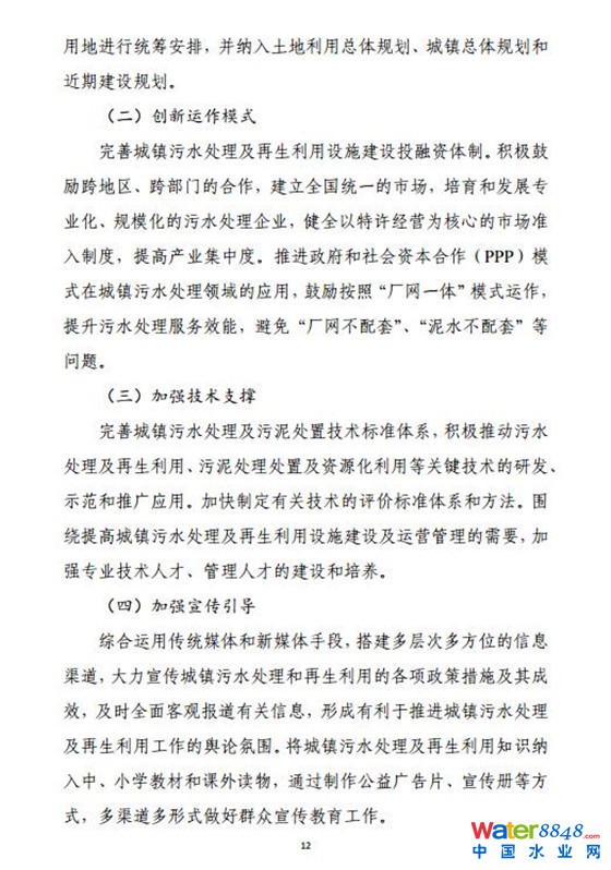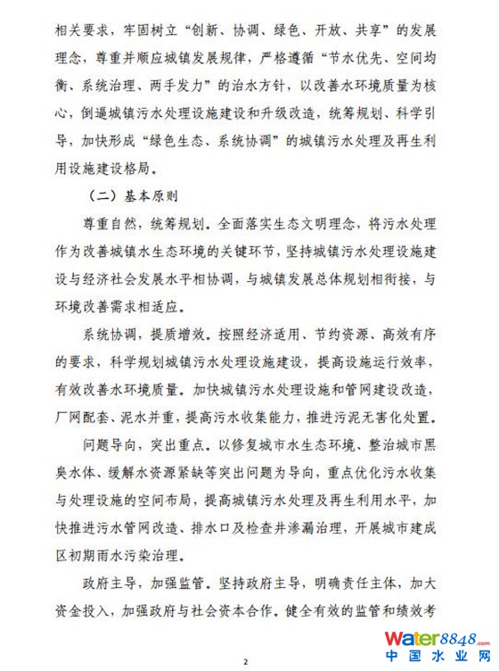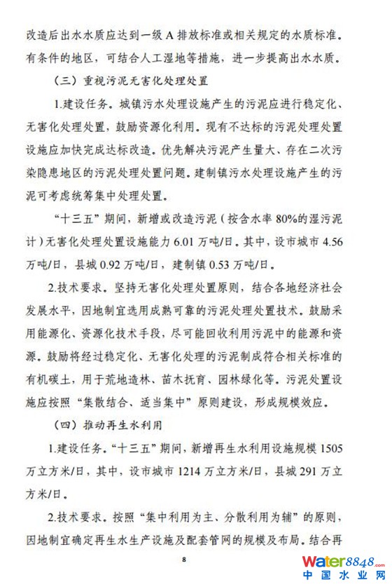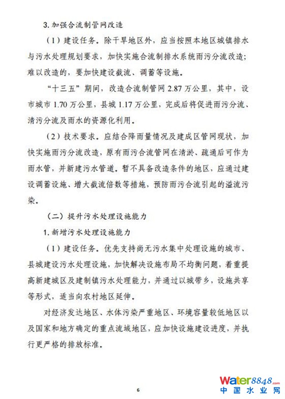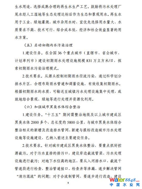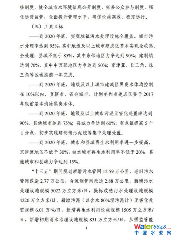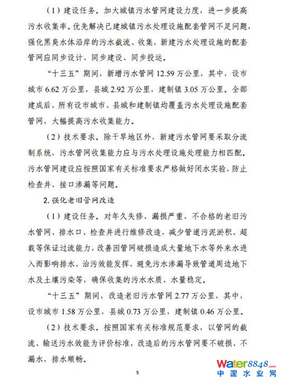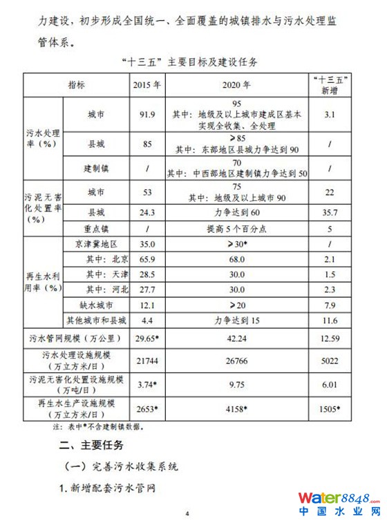 2 相關(guān)要求,牢固樹立“創(chuàng)新、協(xié)調(diào)、綠色、開放、共享”的發(fā)展理念,尊重并順應(yīng)城鎮(zhèn)發(fā)展規(guī)律,嚴(yán)格遵循“節(jié)水優(yōu)先、空間均衡、系統(tǒng)治理、兩手發(fā)力”的治水方針,以改善水環(huán)境質(zhì)量為核心,倒逼城鎮(zhèn)污水處理設(shè)施建設(shè)和升級改造,統(tǒng)籌規(guī)劃、科學(xué)引導(dǎo),加快形成“綠色生態(tài)、系統(tǒng)協(xié)調(diào)”的城鎮(zhèn)污水處理及再生利用設(shè)施建設(shè)格局。(二)基本原則尊重自然,統(tǒng)籌規(guī)劃。全面落實(shí)生態(tài)文明理念,將污水處理作為改善城鎮(zhèn)水生態(tài)環(huán)境的關(guān)鍵環(huán)節(jié),堅持城鎮(zhèn)污水處理設(shè)施建設(shè)與經(jīng)濟(jì)社會發(fā)展水平相協(xié)調(diào),與城鎮(zhèn)發(fā)展總體規(guī)劃相銜接,與環(huán)境改善需求相適應(yīng)。系統(tǒng)協(xié)調(diào),提質(zhì)增效。按照經(jīng)濟(jì)適用、節(jié)約資源、高效有序的要求,科學(xué)規(guī)劃城鎮(zhèn)污水處理設(shè)施建設(shè),提高設(shè)施運(yùn)行效率,有效改善水環(huán)境質(zhì)量。加快城鎮(zhèn)污水處理設(shè)施和管網(wǎng)建設(shè)改造,廠網(wǎng)配套、泥水并重,提高污水收集能力,推進(jìn)污泥無害化處置。問題導(dǎo)向,突出重點(diǎn)。以修復(fù)城市水生態(tài)環(huán)境、整治城市黑臭水體、緩解水資源緊缺等突出問題為導(dǎo)向,重點(diǎn)優(yōu)化污水收集與處理設(shè)施的空間布局,提高城鎮(zhèn)污水處理及再生利用水平,加快推進(jìn)污水管網(wǎng)改造、排水口及檢查井滲漏治理,開展城市建成區(qū)初期雨水污染治理。政府主導(dǎo),加強(qiáng)監(jiān)管。堅持政府主導(dǎo),明確責(zé)任主體,加大資金投入,加強(qiáng)政府與社會資本合作。健全有效的監(jiān)管和績效考 3 核制度,健全城市水環(huán)境信息公開制度,完善公眾參與制度,強(qiáng)化運(yùn)營監(jiān)管,全面提升管理水平,確保設(shè)施高效、穩(wěn)定運(yùn)行。(三)主要目標(biāo) ——到 2020 年底,實(shí)現(xiàn)城鎮(zhèn)污水處理設(shè)施全覆蓋。城市污水處理率達(dá)到 95%,其中地級及以上城市建成區(qū)基本實(shí)現(xiàn)全收集、全處理;縣城不低于 85%,其中東部地區(qū)力爭達(dá)到 90%;建制鎮(zhèn)達(dá)到 70%,其中中西部地區(qū)力爭達(dá)到 50%;京津冀、長三角、珠三角等區(qū)域提前一年完成。 ——到 2020 年底,地級及以上城市建成區(qū)黑臭水體均控制在 10%以內(nèi)。直轄市、省會城市、計劃單列市建成區(qū)要于 2017 年底前基本消除黑臭水體。 ——到 2020 年底,地級及以上城市污泥無害化處置率達(dá)到 90%,其他城市達(dá)到 75%;縣城力爭達(dá)到 60%;重點(diǎn)鎮(zhèn)提高 5 個百分點(diǎn),初步實(shí)現(xiàn)建制鎮(zhèn)污泥統(tǒng)籌集中處理處置。 ——到 2020 年底,城市和縣城再生水利用率進(jìn)一步提高。京津冀地區(qū)不低于 30%,缺水城市再生水利用率不低于 20%,其他城市和縣城力爭達(dá)到 15%。 “十三五”期間規(guī)劃新增污水管網(wǎng) 12.59 萬公里,老舊污水管網(wǎng)改造 2.77 萬公里,合流制管網(wǎng)改造 2.88 萬公里,新增污水處理設(shè)施規(guī)模 5022 萬立方米/日,提標(biāo)改造污水處理設(shè)施規(guī)模 4220 萬立方米/日,新增污泥(以含水 80%濕污泥計)無害化處置規(guī)模 6.01 萬噸/日,新增再生水利用設(shè)施規(guī)模 1505 萬立方米/ 日,新增初期雨水治理設(shè)施規(guī)模 831 萬立方米/日,加強(qiáng)監(jiān)管能 4 力建設(shè),初步形成全國統(tǒng)一、全面覆蓋的城鎮(zhèn)排水與污水處理監(jiān)管體系。 “十三五”主要目標(biāo)及建設(shè)任務(wù)指標(biāo) 2015 年 2020 年 “十三五” 新增污水處理率(%)城市 91.9 95 其中:地級及以上城市建成區(qū)基本實(shí)現(xiàn)全收集、全處理 3.1 縣城 85 ≥85 其中:東部地區(qū)縣城力爭達(dá)到 90 / 建制鎮(zhèn) / 70 其中:中西部地區(qū)建制鎮(zhèn)力爭達(dá)到 50 / 污泥無害化處置率(%)城市 53 75 其中:地級及以上城市 90 22 縣城 24.3 力爭達(dá)到 60 35.7 重點(diǎn)鎮(zhèn) / 提高 5 個百分點(diǎn) 5 再生水利用率(%)京津冀地區(qū) 35.0 ≥30* / 其中:北京 65.9 68.0 2.1 其中:天津 28.5 30.0 1.5 其中:河北 27.7 30.0 2.3 缺水城市 12.1 ≥20 7.9 其他城市和縣城 4.4 力爭達(dá)到 15 11.6 污水管網(wǎng)規(guī)模(萬公里) 29.65* 42.24 12.59 污水處理設(shè)施規(guī)模(萬立方米/日) 21744 26766 5022 污泥無害化處置設(shè)施規(guī)模(萬噸/日) 3.74* 9.75 6.01 再生水生產(chǎn)設(shè)施規(guī)模(萬立方米/日) 2653* 4158* 1505* 注:表中*不含建制鎮(zhèn)數(shù)據(jù)。 二、主要任務(wù)(一)完善污水收集系統(tǒng) 1.新增配套污水管網(wǎng) 5 (1)建設(shè)任務(wù)。加大城鎮(zhèn)污水管網(wǎng)建設(shè)力度,進(jìn)一步提高污水收集率。優(yōu)先解決已建城鎮(zhèn)污水處理設(shè)施配套管網(wǎng)不足問題,強(qiáng)化黑臭水體沿岸的污水截流、收集,新建污水處理設(shè)施的配套管網(wǎng)應(yīng)同步設(shè)計、同步建設(shè)、同步投運(yùn)。 “十三五”期間,新增污水管網(wǎng) 12.59 萬公里,其中,設(shè)市城市 6.62 萬公里,縣城 2.92 萬公里,建制鎮(zhèn) 3.05 萬公里。全部建成后,所有設(shè)市城市、