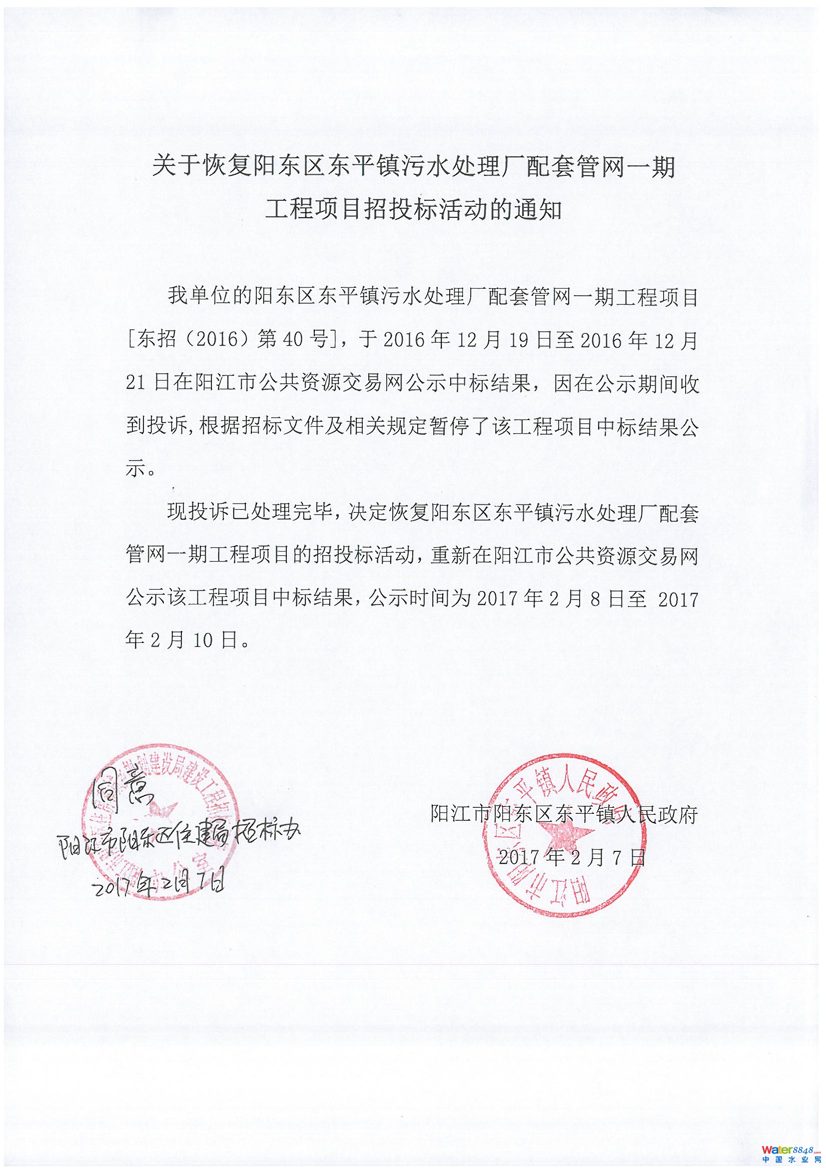 關(guān)于恢復(fù)陽東區(qū)東平鎮(zhèn)污水處理廠配套管網(wǎng)一期工程項目招投標(biāo)活動的通知