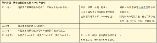 第四階段:清華控股的新發(fā)展(2012年至今)。2012年5月以來(lái),在新的管理團(tuán)隊(duì)推動(dòng)下,清華大學(xué)賦予清華控股以更大的授權(quán),清華控股規(guī)劃了未來(lái)7年的發(fā)展藍(lán)圖,啟動(dòng)了一系列戰(zhàn)略性變革,將高科技與現(xiàn)代金融相結(jié)合,借助自我積累、并購(gòu)、孵化等多種方式,實(shí)現(xiàn)了歷史性的跨越式發(fā)展。期間,2012年9月,清控資產(chǎn)管理有限公司成立,清華控股著手打造產(chǎn)融結(jié)合的金融平臺(tái);2013年1月,清華控股發(fā)布新的戰(zhàn)略規(guī)劃;2013年,紫光集團(tuán)收購(gòu)展訊與銳迪科;2014年,華控技術(shù)轉(zhuǎn)移有限公司和荷塘投資有限公司成立,清華控股加速科技成果轉(zhuǎn)化,等等。在2012-2015年間,清華控股凈資產(chǎn)年均增長(zhǎng)34%,歸屬于母公司的凈利潤(rùn)年均增長(zhǎng)60%。目前,這一變革與發(fā)展仍在持續(xù)中。