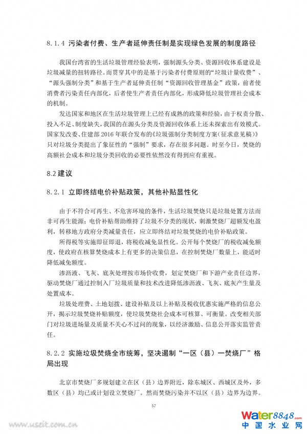 報告建議立即終結生活垃圾焚燒電價補貼政策,用焚燒垃圾處理費表達生活垃圾焚燒處置的全部成本,使社會成本顯性化;建議對非居民生活垃圾征收1000元/噸的焚燒處理費,而不是現(xiàn)在的300元/噸,并嚴格按照實際排放量計量收費;實施垃圾焚燒全市統(tǒng)籌,堅決遏制“一區(qū)(縣)一焚燒廠”格局出現(xiàn);確立權責一致的生活垃圾管理主責部門;建立目標明確的北京市生活垃圾源頭強制分類減量規(guī)劃;對生活垃圾焚燒廠實施排污許可證制度;建立生活垃圾管理統(tǒng)計信息平臺,實現(xiàn)生活活垃圾管理信息全面徹底的公開。