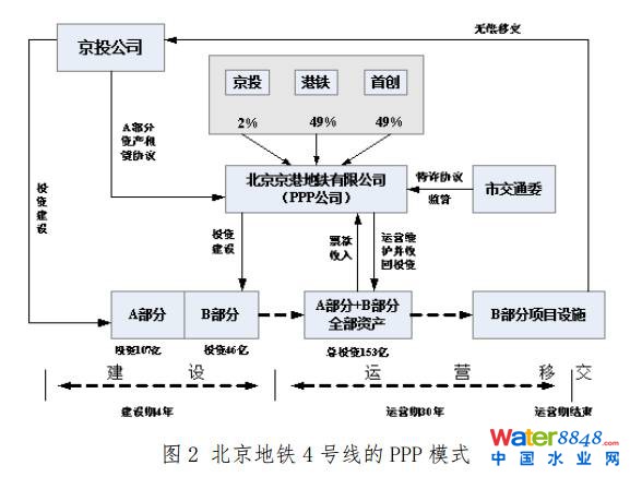4號(hào)線工程投資建設(shè)分為A、B兩個(gè)相對(duì)獨(dú)立的部分:A部分為洞體、車站等土建工程,投資額約為107億元,約占項(xiàng)目總投資的70%,由北京市政府國(guó)有獨(dú)資企業(yè)京投公司成立的全資子公司四號(hào)線公司負(fù)責(zé);B部分為車輛、信號(hào)等設(shè)備部分,投資額約為46億元,約占項(xiàng)目總投資的30%,由PPP項(xiàng)目公司北京京港地鐵有限公司(簡(jiǎn)稱“京港地鐵”)負(fù)責(zé)。京港地鐵是由京投公司、香港地鐵公司和首創(chuàng)集團(tuán)按2:49:49的出資比例組建。